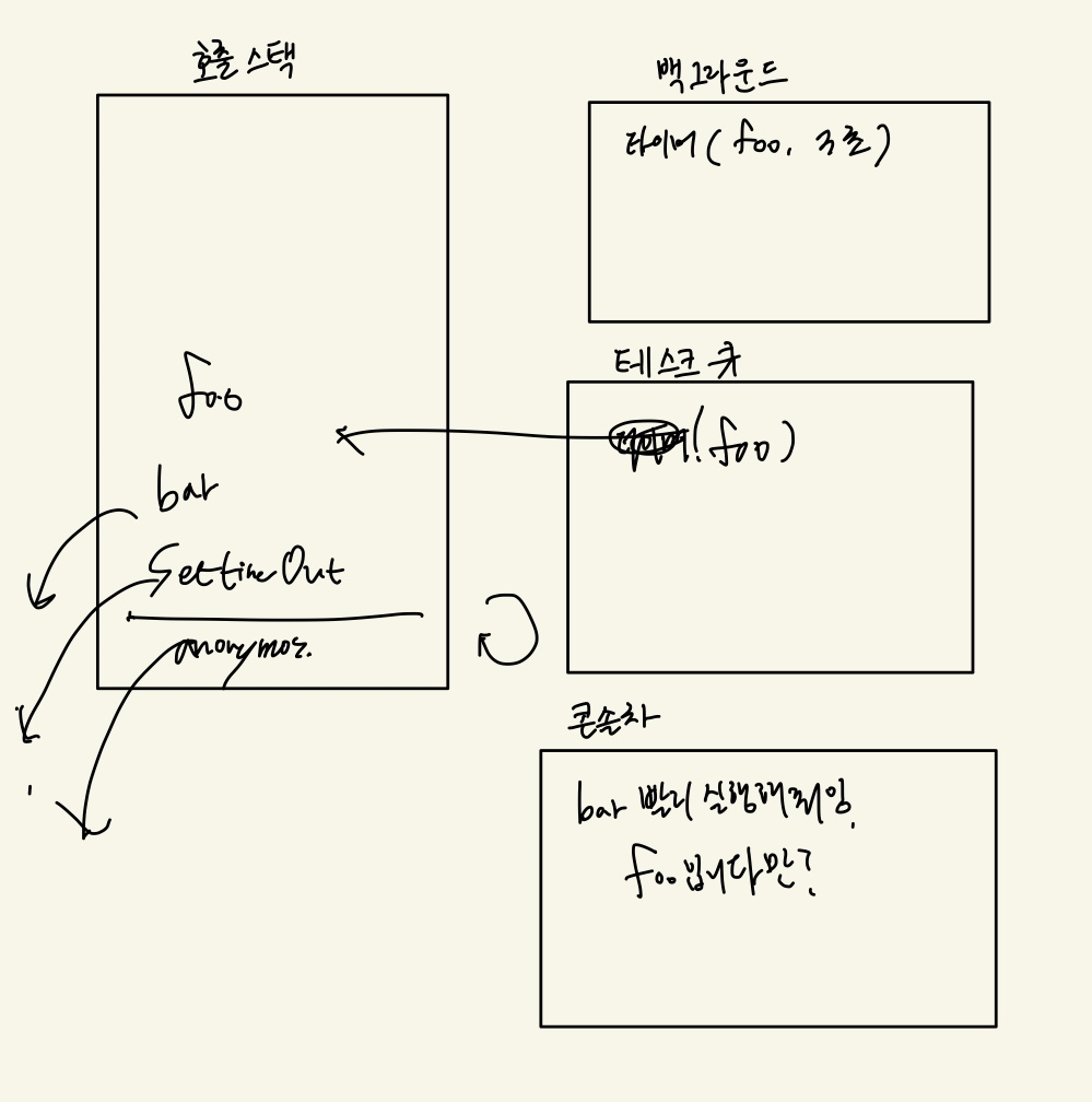 - 이벤트 루프가 콜 스택이 빈 것을 확인하고 태스크 큐에서 대기 중인 콜백 함수 foo를 콜 스택에 푸시합니다.