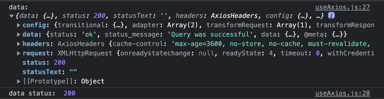 화면에는 단축평가를 이용해 data를 정상적으로 받아왔을 때 data.status를 보여줍니다.