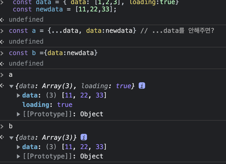 그리고 setState로 값을 갱신할 때 spread로 이전 값을 가지고 오는 이유는 다음과 같습니다. 안 해주면 다른 프로퍼티가 날아가버려요. (당연함.. 그냥 갈아 끼우는 거심..)