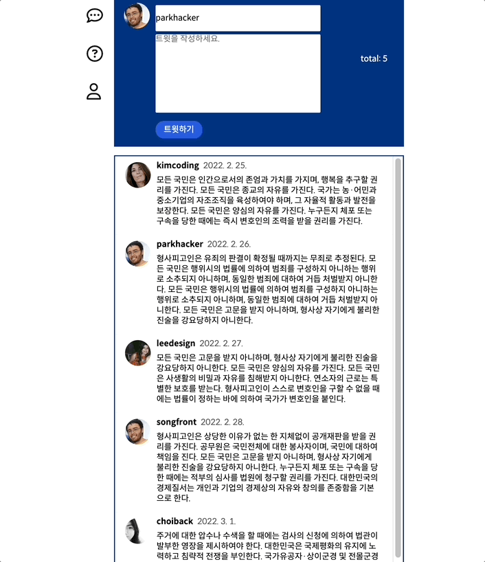 기존 과제는 트윗을 전송 시 전송한 트윗은 메인화면 가장 위에 띄우는 것입니다. 그리고 mypage에 갔을 때는 본인 트윗만 띄우는 게 끝이에요.