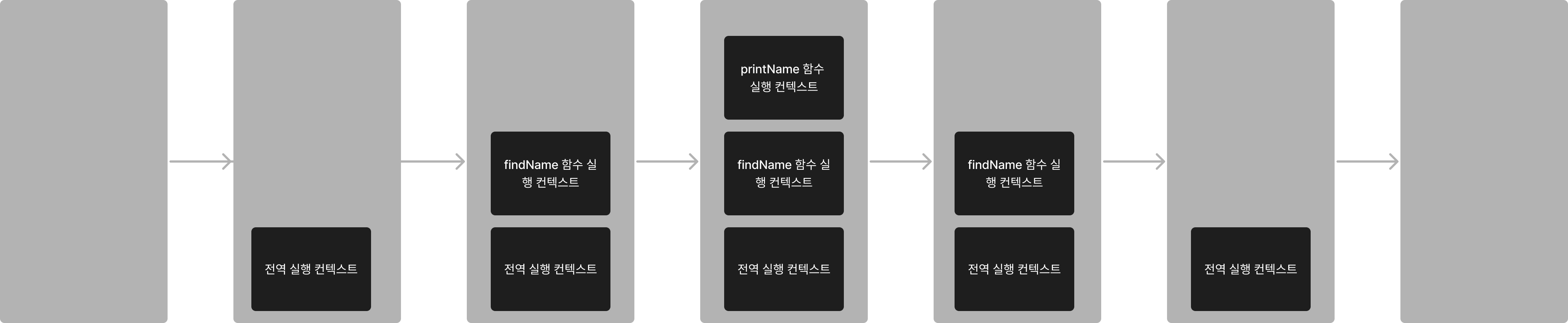 3. findName 함수 평가 및 실행, printName 함수 호출 시 findName 코드 실행 중단. printName 함수 실행 컨텍스트 생성 + 스택에 push, printName 함수가 종료되면 스택에서 pop