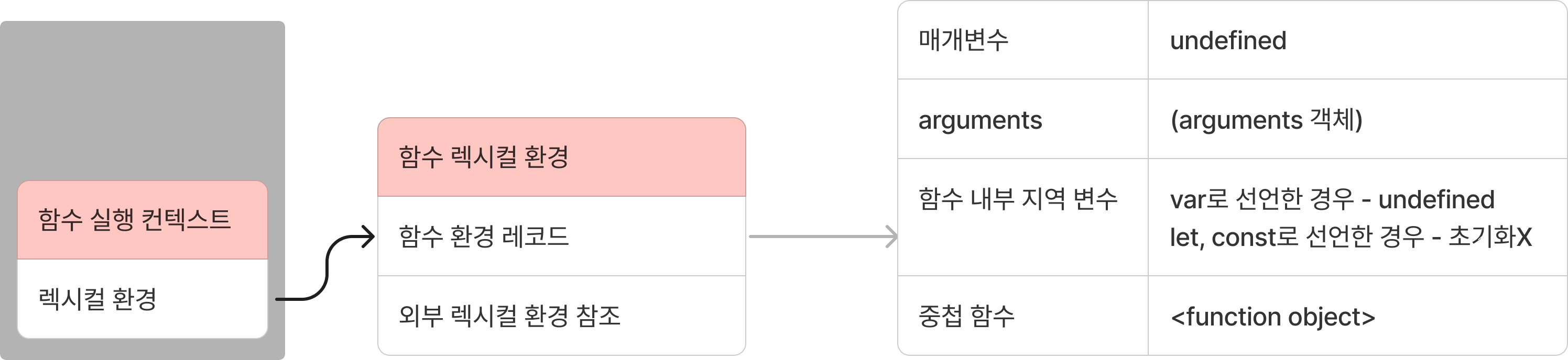 이때 선언적 환경 레코드를 가지는 렉시컬 환경을 새롭게 생성하여 기존 렉시컬 환경과 교체하는데 새롭게 생성된 렉시컬 환경의 외부 렉시컬 환경에 대한 참조는 기존 렉시컬 환경이 됩니다.